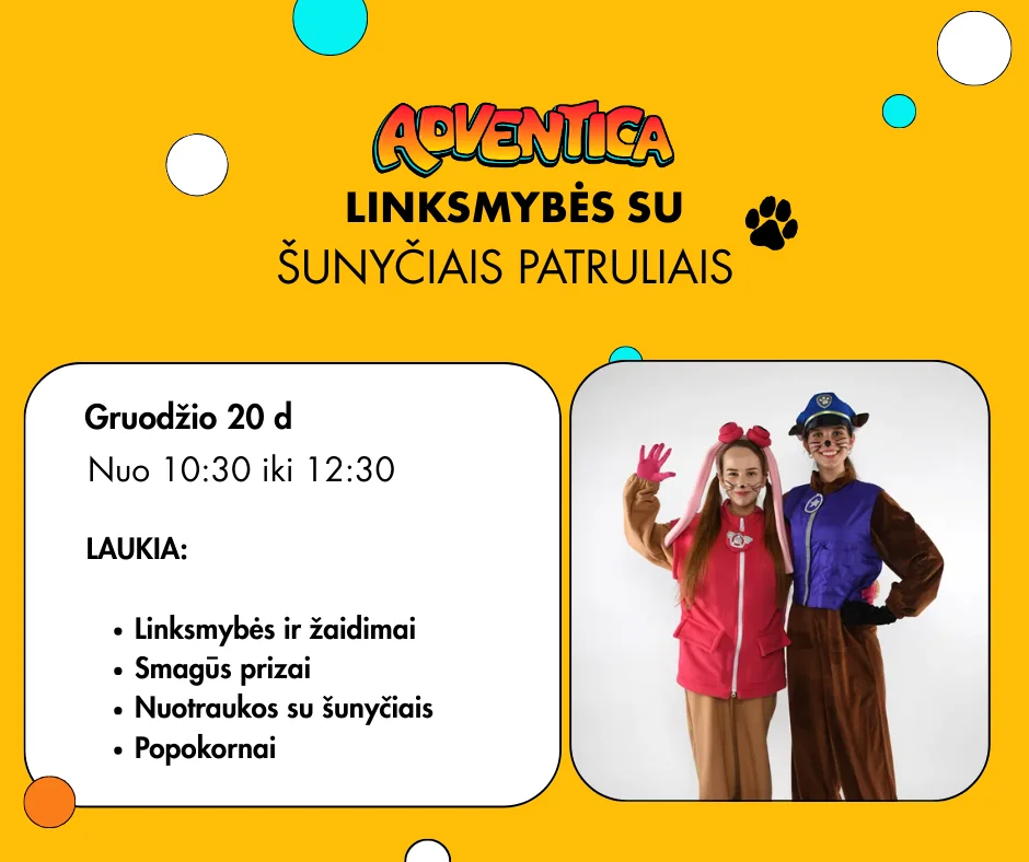Gruodžio 20 d. 10:30 – Adventica parke šunyčiai patruliai sugrįžta! Sky ir Cheisas!